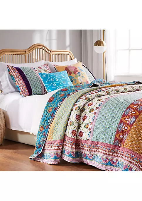 Rows of vivid medallions, stylized florals and geometric prints create distinctive bohemian styling. The Thalia quilt set features mitered borders and multi-fabric construction embellished with velvet bands. Quilt set comes with quilt and two pillow shams (one sham per Twin set), plus two coordinating stuffed decorative pillows. With bold pops of teal and gold, the Thalia pillow set adds distinctive character and comfort to any space. Embroidery embellished teal pillow features waves and flower blossom motifs stitched in white yarn on a rich blue green ground. Colorfully printed gold pillow features floral bouquet, songbird and pompoms along the border. Quilt reverses to a coordinating updated floral print on a Caribbean blue ground. Oversized for better coverage on todayβs deeper mattresses. Machine quilted with fabric bound edges for durability and surface interest. Dimensions: King set includes one 105×95-inch quilt, two 20×36-inch pillow shams, plus one 14×20-inch decorative pillow and one 18×18-inch decorative pillow. Quilt and shams: face 95% cotton with 5% polyester velvet embellishment; back and fill 100% cotton. Dec Pillows feature 100% polyester removable canvas covers and polyester inserts. Machine Wash quilt, shams(s) and pillow covers. Spot clean only pillow insert cushions.