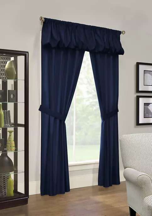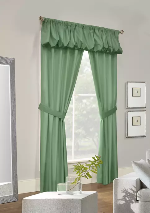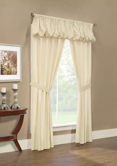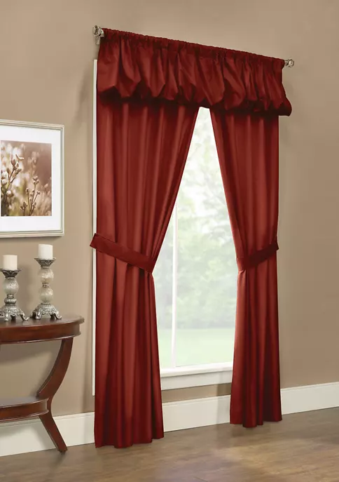 The 5-piece set consists of 2 panels, choice of 63-inch length or 84-inch length, 1 valance, and 1 pair of tiebacks